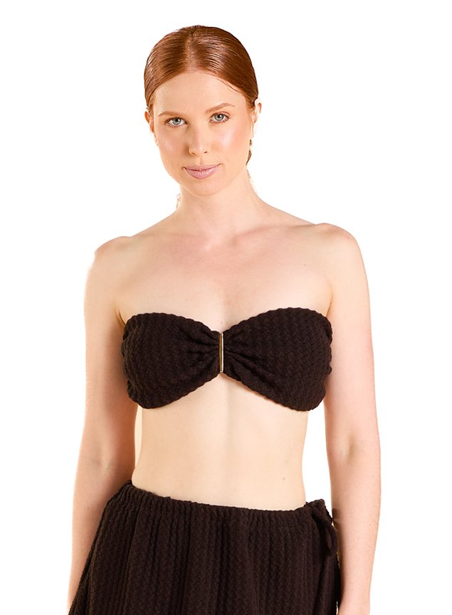 TRICOT CARLA P20466Sofisticado e atemporal, o top tomara que caia em tricot traz um visual elegante e cheio de charme para os dias de sol. Com textura encorpada e toque artesanal, o modelo possui detalhe central franzido com acessório metálico dourado banhado a ouro 24k que valoriza o busto com delicadeza. A estrutura firme do tricot proporciona sustentação leve e caimento impecável. Ideal para quem busca conforto sem abrir mão da elegância à beira-mar ou na piscina. Com gramatura de 250g/m², o tricot é um tecido de malharia sofisticada que une estrutura leve, textura marcante e caimento confortável. Sua construção em pontos aparentes traz um visual artesanal contemporâneo, que valoriza tanto o design minimalista quanto modelagens mais elaboradas. Ideal para peças que pedem toque macio, elasticidade natural e elegância descomplicada. A gramatura intermediária oferece boa cobertura e caimento fluido, mantendo a leveza necessária para os dias mais amenos. Além do conforto térmico, o tecido apresenta toque suave, respirabilidade e excelente comportamento em peças que pedem movimento, tornando-se uma escolha versátil para criações que equilibram moda, conforto e sofisticação natural.