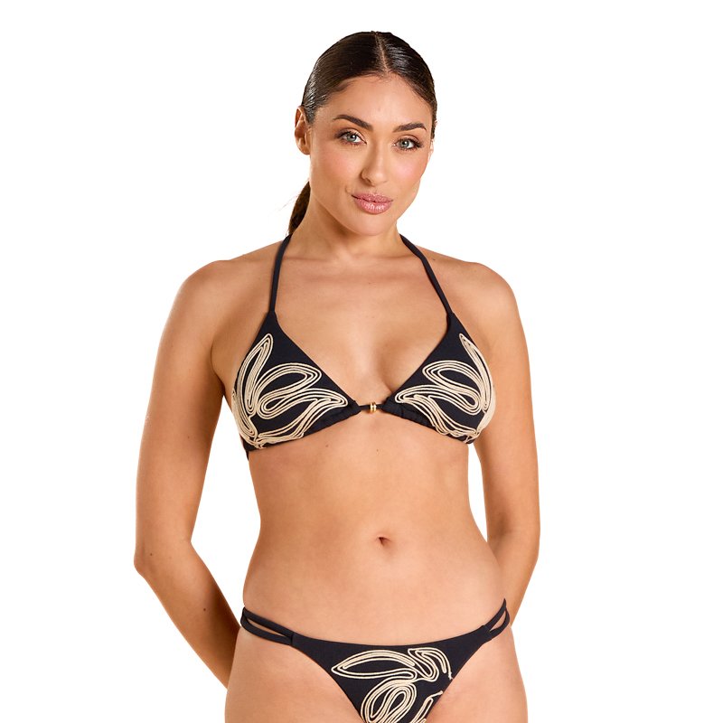 O tradicional e clássico. O modelo de Biquíni Cortininha tem o recorte triangular com maior cobertura em evidência e é a opção de amarração com regulagem livre para adaptação aos diferentes tipos de corpos e propostas.