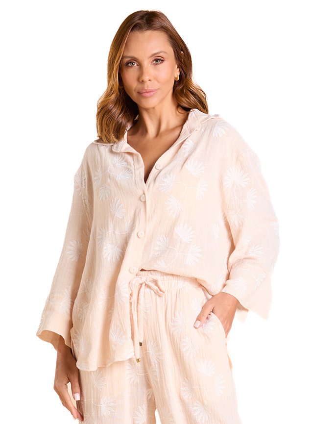 Com toque suave e acabamento impecável, a camisa bordada traz elegância e leveza para composições casuais ou de resort. Confeccionada em tecido leve e fluido com bordados em relevo que remetem à natureza, possui modelagem ampla, punho alongado com abotoamento duplo e caimento perfeito. Os botões encapados na mesma cor do tecido reforçam a sofisticação e o cuidado nos detalhes. Um clássico atemporal que combina com peças do mesmo tom ou sobreposições coloridas. O Gaze é um tecido plano de dupla camada, composto por 100% algodão e com gramatura de 125g/m², que une leveza extrema, conforto térmico e sofisticação natural. Sua estrutura dupla garante toque macio e volume delicado, proporcionando um caimento leve com acabamento artesanal e visual rústico-chique. Por ser 100% algodão, o Gaze Nilo Double oferece alta respirabilidade, sensação de frescor ao toque e suavidade para a pele, sendo ideal para dias quentes e peças que pedem naturalidade e elegância. Apesar de sua leve gramatura, a construção dupla proporciona boa cobertura e estrutura suave, equilibrando transparência e conforto com um visual naturalmente sofisticado. Um tecido versátil, contemporâneo e atemporal para quem valoriza o essencial com estilo.