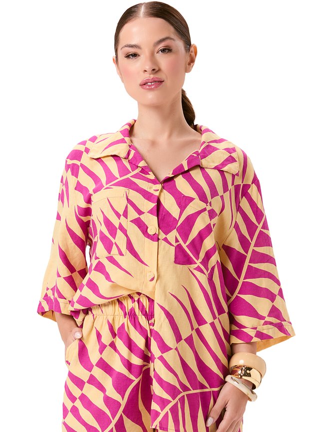 Com toque suave e modelagem ampla, essa camisa em gaze é perfeita para composições leves e sofisticadas. As mangas médias dobradas e os botões encapados trazem charme ao visual, enquanto o tecido fluido proporciona frescor e liberdade de movimento. Ideal para ser usada como saída de praia ou sobreposição em looks casuais com elegância e naturalidade. Tecido em composição nobre de 55% linho e 45% viscose, com gramatura leve de 120 g/m², que une o frescor natural do linho à fluidez e ao toque macio da viscose. O resultado é um material de caimento elegante e textura suave, com aparência levemente rústica e brilho sutil.