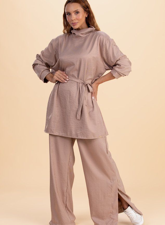 A calça estilo pantalona ampla é perfeita para complementar a blusa, proporcionando um visual elegante e confortável. Com uma modelagem ampla, ela garante liberdade de movimento e um caimento fluido. A abertura abaixo na lateral adiciona um toque contemporâneo, enquanto o elástico na cintura oferece um ajuste confortável e prático.