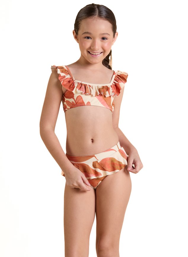 Delicado, confortável e cheio de charme! Este conjunto de biquíni infantil é confeccionado em tecido Fluity com estampa exclusiva Mardu, que traz um toque divertido e sofisticado ao visual das pequenas. O top possui alcinhas com babados que emolduram o colo com leveza, enquanto a calcinha conta com sobreposição em babado na cintura, garantindo um caimento fofo e confortável para brincar e aproveitar os dias de sol. Ideal para curtir o verão com liberdade, proteção e estilo! O Fluity é um tecido de alta performance com gramatura de 190g/m², desenvolvido para oferecer leveza extrema, caimento fluido e toque geladinho. Composto por 88% poliamida e 12% elastano, proporciona elasticidade confortável, além de se adaptar perfeitamente ao corpo com sensação de segunda pele. Sua gramatura leve é ideal para modelagens que pedem movimento, frescor e conforto térmico. A superfície levemente acetinada valoriza cores e estampas, trazendo sofisticação ao visual final da peça. Além do toque agradável e da fluidez natural, o Fluity oferece proteção UV50+, secagem rápida e alta respirabilidade, tornando-se uma escolha ideal para peças versáteis, frescas e elegantes — com a qualidade que une tecnologia e bem-estar.