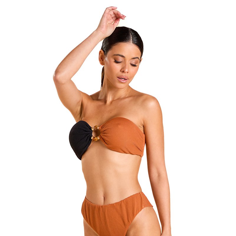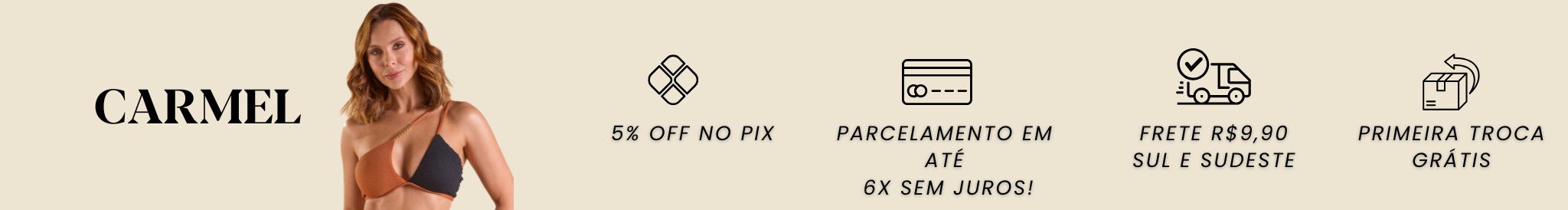 Carmel - Com gramatura de 235g/m² e composição de 87% poliamida e 13% elastano, o tecido Carmel combina estrutura, toque macio e elasticidade controlada, com caimento elegante, proteção UV50+ e secagem rápida — ideal para peças sofisticadas que pedem presença, conforto e tecnologia.