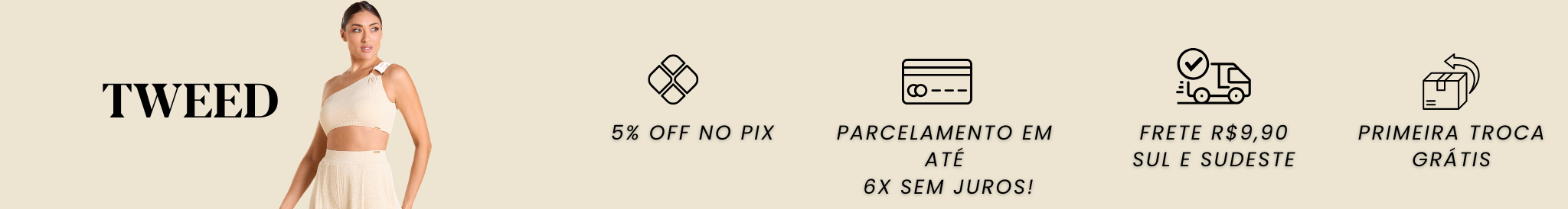 Tweed - Com gramatura de 300g/m² e composição de 87% poliamida e 13% elastano, o tecido Tweed apresenta uma releitura contemporânea de um clássico, unindo estrutura encorpada, toque macio, conforto térmico, elasticidade e proteção UV50+ — ideal para criações elegantes, atemporais e com visual de luxo artesanal.