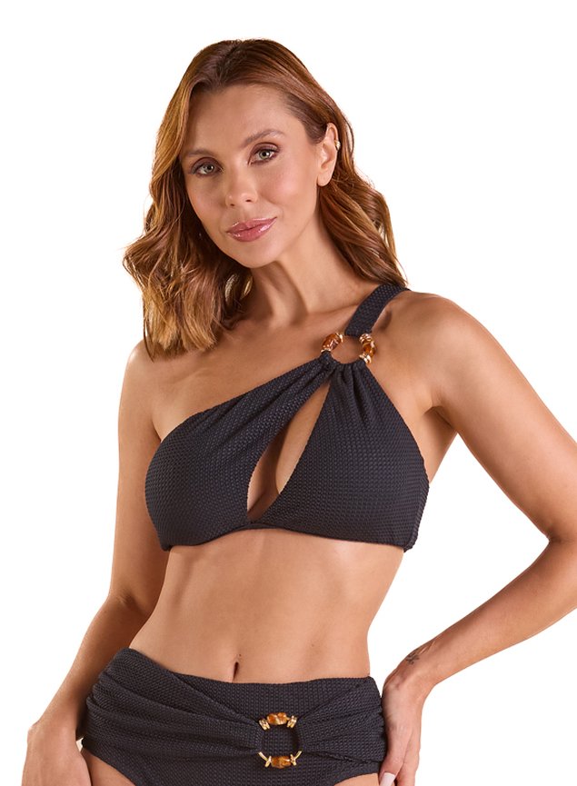 Um busto marcante e moderno, com modelagem assimétrica e aro central em resina e metal banhado a ouro 24k, que adiciona um toque sofisticado à peça. O tecido Carmel traz textura elegante com toque macio e confortável. O fecho nas costas e a alça ajustável proporcionam segurança e encaixe perfeito ao corpo. Uma peça contemporânea para quem busca elegância e personalidade na praia ou no resort. O tecido Carmel traz sofisticação e tecnologia em uma base de gramatura 235g/m², perfeita para modelagens que pedem estrutura, cobertura e caimento elegante. Composto por 87% poliamida e 13% elastano, ele proporciona elasticidade controlada, excelente ajuste ao corpo e toque extremamente macio com sensação de frescor. Sua textura levemente encorpada valoriza peças que pedem presença e firmeza, como maiôs, biquínis estruturados, tops, bodies. A gramatura intermediária garante zero transparência e um visual mais nobre e refinado, mantendo o conforto e a leveza ao vestir. Além do visual premium, o Carmel oferece proteção UV50+, secagem rápida, alto poder de recuperação e excelente durabilidade, sendo ideal para criações versáteis que combinam elegância, tecnologia e bem-estar.