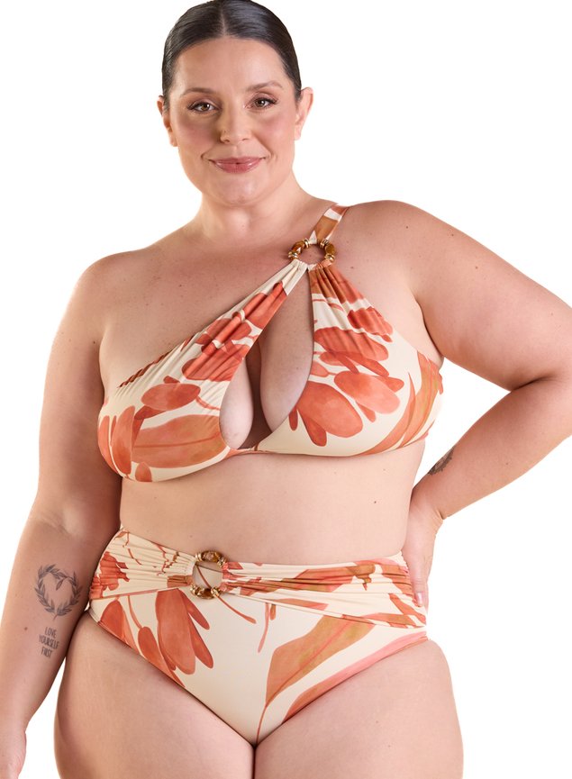 Um busto marcante e moderno, com modelagem assimétrica e aro central em resina e metal banhado a ouro 24k, que adiciona um toque sofisticado à peça. O tecido traz textura elegante com toque macio e confortável. O fecho nas costas e a alça ajustável proporcionam segurança e encaixe perfeito ao corpo. Uma peça contemporânea para quem busca elegância e personalidade na praia ou no resort. O Fluity é um tecido de alta performance com gramatura de 190g/m², desenvolvido para oferecer leveza extrema, caimento fluido e toque geladinho. Composto por 88% poliamida e 12% elastano, proporciona elasticidade confortável, além de se adaptar perfeitamente ao corpo com sensação de segunda pele. Sua gramatura leve é ideal para modelagens que pedem movimento, frescor e conforto térmico. A superfície levemente acetinada valoriza cores e estampas, trazendo sofisticação ao visual final da peça. Além do toque agradável e da fluidez natural, o Fluity oferece proteção UV50+, secagem rápida e alta respirabilidade, tornando-se uma escolha ideal para peças versáteis, frescas e elegantes — com a qualidade que une tecnologia e bem-estar.CORA YBÁ: (REF: M173) Tradução do significado de CORA: remete à raiz da palavra “Coração” / “Alma” e “Essência” – Tradução significado de YBÁ: do tupi, significa “FRUTA” ou “FLOR”. Essa estampa da coleção Essências & Raízes da Mardu é um verdadeiro convite à contemplação e à delicadeza da natureza tropical. Estampa que transbordam identidade e poesia natural — refletindo a mulher Mardu que carrega sua essência com beleza e leveza. Em um fundo claro que transmite leveza e frescor, os ramos florais em tons de terracota, argila e toques suaves de verde oliva formam uma composição artística de traços aquarelados. As folhas alongadas e as flores pendentes remetem à vegetação nativa, como se fossem registradas em um diário botânico à mão livre — espontâneas, femininas e cheias de significado. Ela transmite a conexão com o natural de forma sensível, representando o cuidado com as raízes e a valorização da simplicidade que encanta. A paleta terrosa reforça o conceito de origem e pertencimento, alinhando-se com a estética calorosa e refinada da coleção.