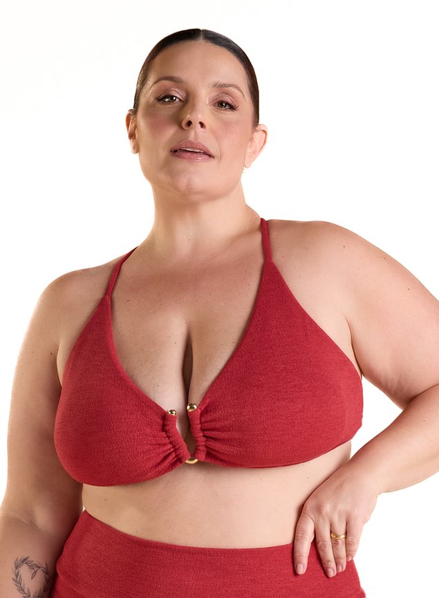 BOUCL PLUS P20454Top com textura elegante e toque macio, ideal para quem busca conforto com sofisticação. O modelo conta com detalhe central franzido e ponteiras metálicas douradas banhadas a ouro 24K, que valorizam o decote com charme sutil. Possui alças finas ajustáveis e estrutura sem bojo, proporcionando sustentação natural e caimento impecável ao corpo. Um clássico atemporal com acabamento refinado, perfeito para dias de sol com estilo. O Bouclê Plus é um tecido de visual sofisticado e textura marcante, com gramatura de 320g/m², que entrega estrutura, conforto térmico e acabamento premium. Composto geralmente por fibras como poliamida, elastano e viscose, sua superfície bouclê confere um toque texturizado, elegante e moderno — perfeito para quem busca exclusividade com informação de moda. Sua gramatura elevada proporciona excelente cobertura e sustentação, ideal para peças. Mesmo encorpado, o tecido mantém elasticidade moderada, bom caimento e conforto ao vestir. O Bouclê Plus é uma escolha que une moda e performance: toque macio, secagem rápida, resistência ao uso e visual rico, valorizando modelagens minimalistas e contemporâneas com uma pegada texturizada e autoral.