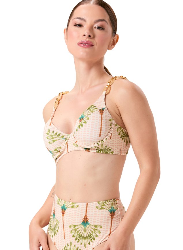 Com design estruturado e elegante, o top meia-taça oferece sustentação e sofisticação em cada detalhe. Possui bojo removível, aro embutido e alças com delicadas correntes de resina e metais banhados a ouro 24k, que valorizam o colo e adicionam um toque de luxo à peça. As alças contam com regulagem para ajuste ideal, enquanto o fecho posterior em metal dourado garante segurança e conforto. Confeccionado em tecido Fluity, de toque leve e gelado, com secagem rápida e proteção UV50+, é perfeito para dias ensolarados com glamour e elegância. O Fluity é um tecido de alta performance com gramatura de 190g/m², desenvolvido para oferecer leveza extrema, caimento fluido e toque geladinho. Composto por 88% poliamida e 12% elastano, proporciona elasticidade confortável e adapta-se perfeitamente ao corpo, com sensação de segunda pele. Sua gramatura leve é ideal para modelagens que pedem movimento, frescor e conforto térmico. A superfície levemente acetinada valoriza cores e estampas, trazendo sofisticação ao visual final da peça. Além do toque agradável e da fluidez natural, o Fluity oferece proteção UV50+, secagem rápida e alta respirabilidade, tornando-se uma escolha ideal para peças versáteis, frescas e elegantes — com a qualidade que une tecnologia e bem-estar.