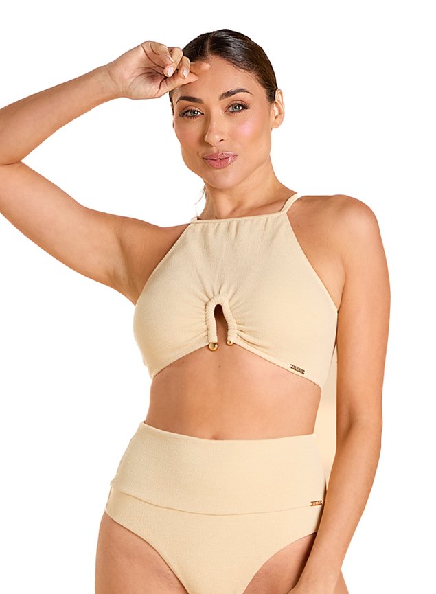 Com design moderno e toque de sofisticação, este top em tecido Bouclê traz elegância para os dias de sol. A modelagem com gola alta alonga a silhueta e o recorte central com franzido valoriza o busto de forma delicada. O tecido Bouclê — encorpado, texturizado e extremamente confortável — oferece sustentação com toque macio e visual refinado. O detalhe em aviamento banhado a ouro 24k, reforça a exclusividade da peça. Ideal para compor looks de verão com estilo, seja na praia, no resort ou em produções urbanas com mood Balneário. O Bouclê Plus é um tecido de visual sofisticado e textura marcante, com gramatura de 320g/m², que entrega estrutura, conforto térmico e acabamento premium. Composto geralmente por fibras como poliamida, elastano e viscose, sua superfície bouclê confere um toque texturizado, elegante e moderno — perfeito para quem busca exclusividade com informação de moda. Sua gramatura elevada proporciona excelente cobertura e sustentação, ideal para peças. Mesmo encorpado, o tecido mantém elasticidade moderada, bom caimento e conforto ao vestir. O Bouclê Plus é uma escolha que une moda e performance: toque macio, secagem rápida, resistência ao uso e visual rico, valorizando modelagens minimalistas e contemporâneas com uma pegada texturizada e autoral.