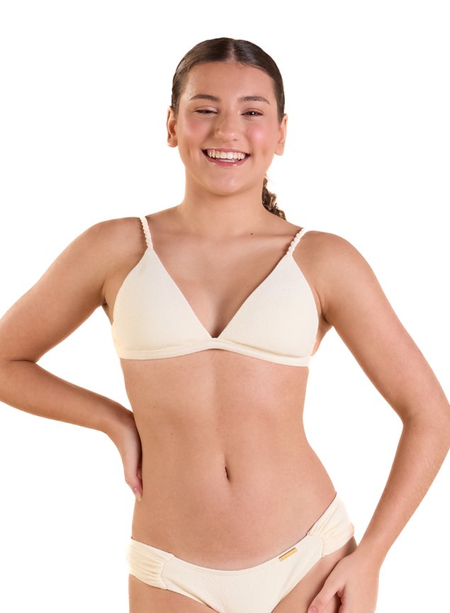 Clássico com toque contemporâneo, o top triângulo traz alças em cordão trançado, que adicionam textura e sofisticação ao visual. Confeccionado em tecido de alta tecnologia com proteção UV50+, o modelo conta com estrutura leve e bojo removível, oferecendo sustentação com conforto. As alças são ajustáveis e o fechamento posterior é feito com peça metálica banhada a ouro 24K, garantindo durabilidade e refinamento. Ideal para quem busca um biquíni versátil, com toque artesanal e acabamento premium. O tecido Bubble Light é uma base texturizada de alto padrão, com gramatura de 220g/m², que une visual sofisticado e desempenho funcional. Composto por 94% poliamida e 6% elastano, oferece elasticidade suave, excelente ajuste ao corpo e toque macio com sensação de frescor, ideal para o clima tropical. Sua superfície com efeito bubble proporciona um visual moderno e elegante, valorizando a tridimensionalidade da peça. A gramatura média garante cobertura eficiente sem transparência, além de um caimento estruturado que favorece diferentes modelagens. Além do visual premium, o Bubble Light conta com secagem rápida, proteção UV50+ e conforto térmico, sendo uma escolha inteligente para quem busca beleza, tecnologia e sofisticação em uma única base.
